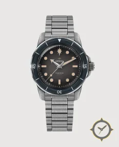 Eine Taucheruhr-Uhr mit einem 31.5mm Gehäuse im Vintage-Stil gefertigt aus Edelstahl mit einem Zifferblatt in grau und einer besonderen "fumé gradient (smoky)"-Oberfläche.
