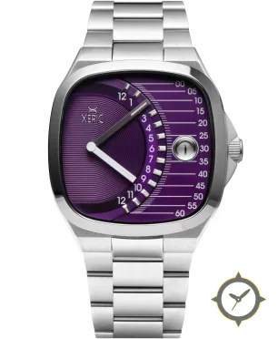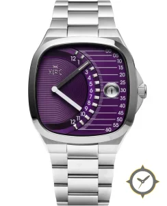 Eine Minimalistisch-Uhr mit einem 37.5mm Gehäuse im Vintage-Stil gefertigt aus Edelstahl mit einem Zifferblatt in lila und einer besonderen "concentric grooved / guilloché rings"-Oberfläche.