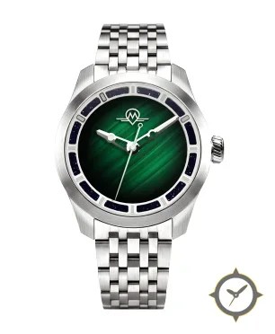 Eine Dress-Uhr mit einem markanten 46mm Auftritt am Handgelenk, gefertigt aus Edelstahl mit einem Zifferblatt in grün und einer besonderen "striated gradient (malachite-like)"-Oberfläche.