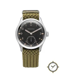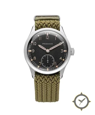 Eine Vintage-Uhr mit einem markanten 52mm Auftritt am Handgelenk, gefertigt aus Edelstahl mit einem Zifferblatt in schwarz und einer besonderen "grained (textured matte)"-Oberfläche.