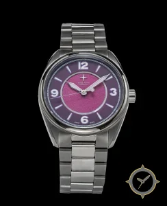 Eine Field-Uhr mit einem markanten 42mm Auftritt am Handgelenk, gefertigt aus Edelstahl mit einem Zifferblatt in lila und einer besonderen "grained inner disk with smooth outer chapter ring"-Oberfläche.
