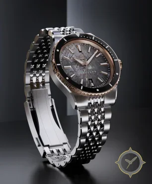 Eine Taucheruhr-Uhr mit einem markanten 45.5mm Auftritt am Handgelenk, gefertigt aus Edelstahl mit einem Zifferblatt in grau und einer besonderen "meteorite-style textured finish"-Oberfläche.