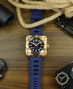 Eine Taucheruhr-Uhr mit einem vielseitigen 40.5mm Gehäuse, das an fast jedes Handgelenk passt, gefertigt aus Bronze mit einem Zifferblatt in marineblau und einer besonderen "matte"-Oberfläche.