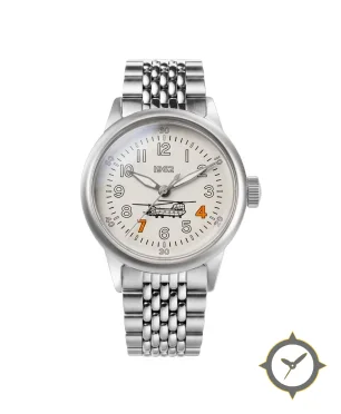 Eine Pilot-Uhr mit einem markanten 41.5mm Auftritt am Handgelenk, gefertigt aus Edelstahl mit einem Zifferblatt in weiß und einer besonderen "matte"-Oberfläche.