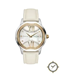 Eine Dress-Uhr mit einem 31mm Gehäuse im Vintage-Stil gefertigt aus Edelstahl mit einem Zifferblatt in weiß und einer besonderen "mother-of-pearl"-Oberfläche.