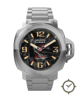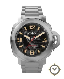 Eine Militär-Uhr mit einem markanten 44mm Auftritt am Handgelenk, gefertigt aus Edelstahl mit einem Zifferblatt in schwarz und einer besonderen "marbled"-Oberfläche.