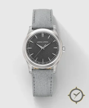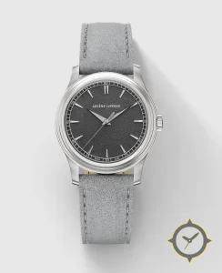 Eine Dress-Uhr mit einem markanten 44mm Auftritt am Handgelenk, gefertigt aus Edelstahl mit einem Zifferblatt in grau und einer besonderen "grained/hammered (textured)"-Oberfläche.