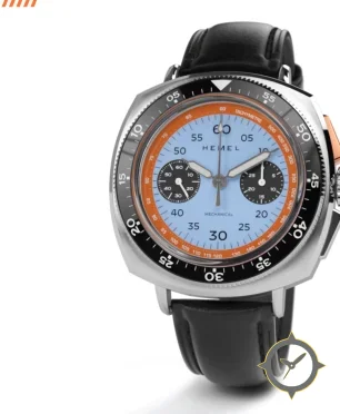 Eine Chronograph-Uhr mit einem markanten 49mm Auftritt am Handgelenk, gefertigt aus Edelstahl mit einem Zifferblatt in blau und einer besonderen "lacquer"-Oberfläche.