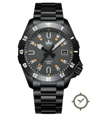 Eine Taucheruhr-Uhr mit einem vielseitigen 39.5mm Gehäuse, das an fast jedes Handgelenk passt, gefertigt aus Edelstahl mit einem Zifferblatt in grau und einer besonderen "textured/grainy (sandblasted)"-Oberfläche.