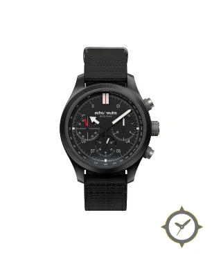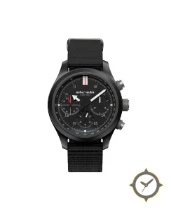Eine Chronograph-Uhr mit einem 35mm Gehäuse im Vintage-Stil gefertigt aus Beschichtung mit einem Zifferblatt in schwarz und einer besonderen "matte"-Oberfläche.