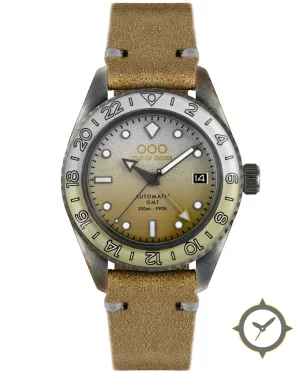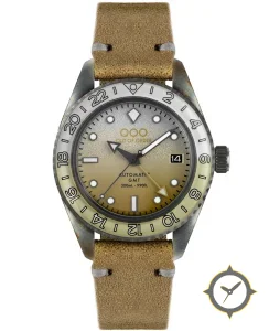 Eine GMT-Uhr mit einem markanten 44.5mm Auftritt am Handgelenk, gefertigt aus Edelstahl mit einem Zifferblatt in gold und einer besonderen "textured/grainy"-Oberfläche und einer echten GMT-Funktion, mit der du eine zweite Zeitzone verfolgen kannst.