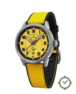 Eine Pilot-Uhr mit einem 37mm Gehäuse im Vintage-Stil gefertigt aus Edelstahl mit einem Zifferblatt in gelb und einer besonderen "matte lacquer"-Oberfläche.