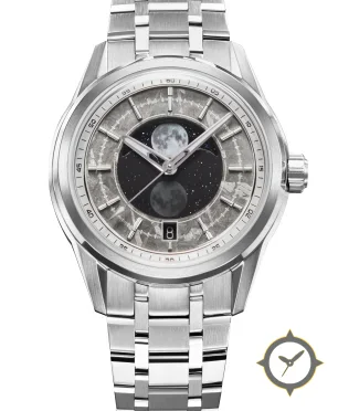 Eine Luxus-Uhr mit einem 32mm Gehäuse im Vintage-Stil gefertigt aus Edelstahl mit einem Zifferblatt in grau und einer besonderen "meteorite texture"-Oberfläche und einer wunderschönen Mondphasenanzeige.