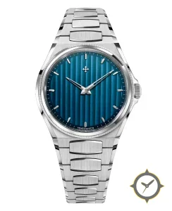 Eine Sport-Uhr mit einem 36.5mm Gehäuse im Vintage-Stil gefertigt aus Edelstahl mit einem Zifferblatt in blau und einer besonderen "vertical ribbed"-Oberfläche.