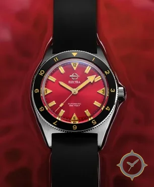 Eine GMT-Uhr mit einem 34mm Gehäuse im Vintage-Stil gefertigt aus Edelstahl mit einem Zifferblatt in rot und einer besonderen "sunburst"-Oberfläche und einer echten GMT-Funktion, mit der du eine zweite Zeitzone verfolgen kannst.