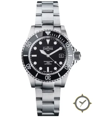 Eine Taucheruhr-Uhr mit einem 36.5mm Gehäuse im Vintage-Stil gefertigt aus Edelstahl mit einem Zifferblatt in schwarz und einer besonderen "matte"-Oberfläche.