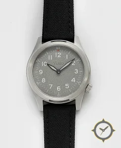 Eine Field-Uhr mit einem 34.5mm Gehäuse im Vintage-Stil gefertigt aus Edelstahl mit einem Zifferblatt in grau und einer besonderen "sandblasted"-Oberfläche.