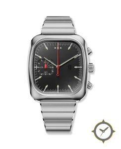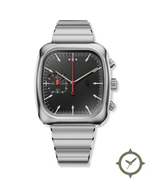 Eine Chronograph-Uhr mit einem 32mm Gehäuse im Vintage-Stil gefertigt aus Edelstahl mit einem Zifferblatt in schwarz und einer besonderen "matte"-Oberfläche.
