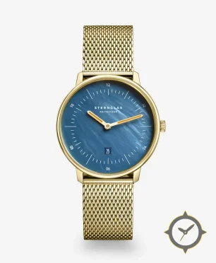 Eine Dress-Uhr mit einem 35.5mm Gehäuse im Vintage-Stil gefertigt aus Gold mit einem Zifferblatt in blau und einer besonderen "mother-of-pearl (iridescent/wavy)"-Oberfläche.