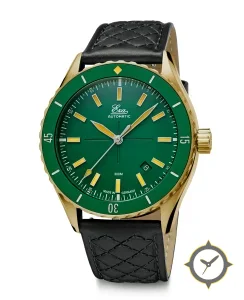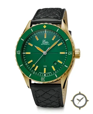 Eine Taucheruhr-Uhr mit einem vielseitigen 38.5mm Gehäuse, das an fast jedes Handgelenk passt, gefertigt aus Gold mit einem Zifferblatt in grün und einer besonderen "matte"-Oberfläche.