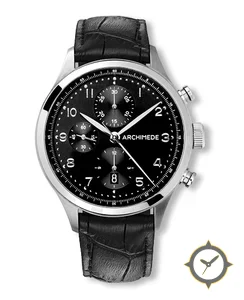 Eine Chronograph-Uhr mit einem 36.5mm Gehäuse im Vintage-Stil gefertigt aus Edelstahl mit einem Zifferblatt in schwarz und einer besonderen "glossy"-Oberfläche.