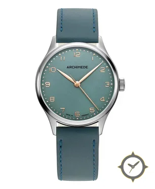 Eine Dress-Uhr mit einem 31.5mm Gehäuse im Vintage-Stil gefertigt aus Edelstahl mit einem Zifferblatt in türkis und einer besonderen "matte"-Oberfläche.