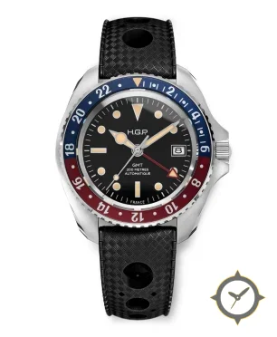 Eine GMT-Uhr mit einem 31mm Gehäuse im Vintage-Stil gefertigt aus Edelstahl mit einem Zifferblatt in schwarz und einer besonderen "matte"-Oberfläche und einer echten GMT-Funktion, mit der du eine zweite Zeitzone verfolgen kannst.