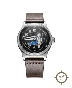 Eine Pilot-Uhr mit einem markanten 42mm Auftritt am Handgelenk, gefertigt aus Edelstahl mit einem Zifferblatt in schwarz und einer besonderen "glossy lacquer"-Oberfläche.