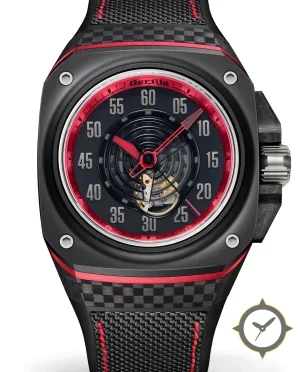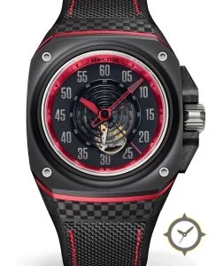 Eine Racing-Uhr mit einem 37mm Gehäuse im Vintage-Stil gefertigt aus Carbon mit einem Zifferblatt in schwarz und einer besonderen "open-heart with concentric ring texture"-Oberfläche.