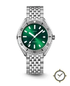 Eine Taucheruhr-Uhr mit einem markanten 45mm Auftritt am Handgelenk, gefertigt aus Edelstahl mit einem Zifferblatt in grün und einer besonderen "sunburst"-Oberfläche.