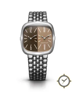 Eine Dress-Uhr mit einem vielseitigen 39mm Gehäuse, das an fast jedes Handgelenk passt, gefertigt aus Edelstahl mit einem Zifferblatt in braun und einer besonderen "brushed (vertical)"-Oberfläche.