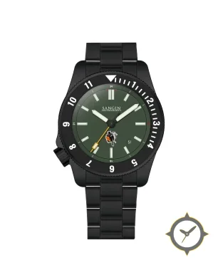 Eine Militär-Uhr mit einem vielseitigen 38mm Gehäuse, das an fast jedes Handgelenk passt, gefertigt aus Edelstahl mit einem Zifferblatt in grün und einer besonderen "matte"-Oberfläche.