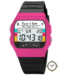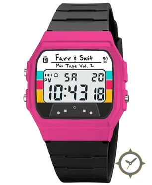 Eine Digital-Uhr mit einem 33mm Gehäuse im Vintage-Stil gefertigt aus Harz mit einem Zifferblatt in weiß und einer besonderen "matte plastic with printed cassette graphic"-Oberfläche.
