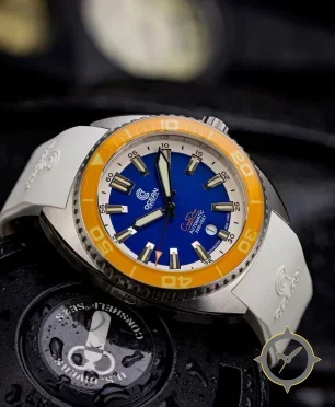 Eine Taucheruhr-Uhr mit einem vielseitigen 39.5mm Gehäuse, das an fast jedes Handgelenk passt, gefertigt aus Edelstahl mit einem Zifferblatt in blau und einer besonderen "sunburst blue lacquer"-Oberfläche.