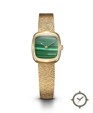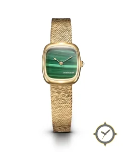 Eine Dress-Uhr mit einem vielseitigen 38.5mm Gehäuse, das an fast jedes Handgelenk passt, gefertigt aus Gold mit einem Zifferblatt in grün und einer besonderen "malachite stone"-Oberfläche.