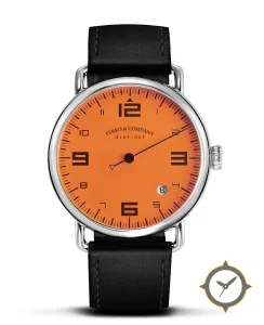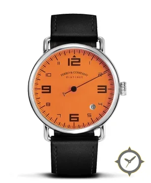 Eine Minimalistisch-Uhr mit einem markanten 47mm Auftritt am Handgelenk, gefertigt aus Edelstahl mit einem Zifferblatt in orange und einer besonderen "matte"-Oberfläche.