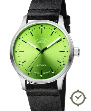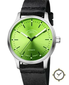 Eine Minimalistisch-Uhr mit einem vielseitigen 38mm Gehäuse, das an fast jedes Handgelenk passt, gefertigt aus Edelstahl mit einem Zifferblatt in grün und einer besonderen "sunburst"-Oberfläche.