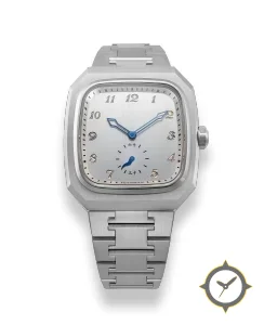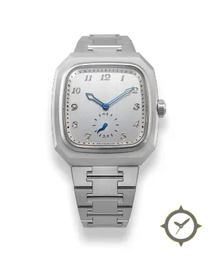 Eine Luxus-Uhr mit einem 34mm Gehäuse im Vintage-Stil gefertigt aus Edelstahl mit einem Zifferblatt in silber und einer besonderen "vertical-brushed"-Oberfläche.