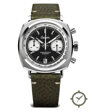 Eine Chronograph-Uhr mit einem markanten 44.5mm Auftritt am Handgelenk, gefertigt aus Edelstahl mit einem Zifferblatt in schwarz und einer besonderen "matte"-Oberfläche.