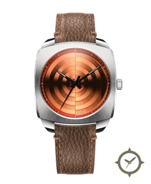 Eine Dress-Uhr mit einem vielseitigen 38.5mm Gehäuse, das an fast jedes Handgelenk passt, gefertigt aus Edelstahl mit einem Zifferblatt in orange und einer besonderen "concentric sunburst brushed"-Oberfläche.