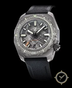 Eine Taucheruhr-Uhr mit einem markanten 52mm Auftritt am Handgelenk, gefertigt aus Titan mit einem Zifferblatt in grau und einer besonderen "meteorite (Widmanstätten)"-Oberfläche.