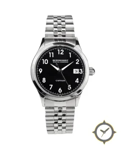 Eine Dress-Uhr mit einem 37mm Gehäuse im Vintage-Stil gefertigt aus Edelstahl mit einem Zifferblatt in schwarz und einer besonderen "glossy"-Oberfläche.