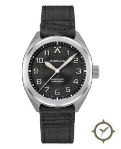 Eine Pilot-Uhr mit einem markanten 46.5mm Auftritt am Handgelenk, gefertigt aus Edelstahl mit einem Zifferblatt in schwarz und einer besonderen "grained/uniform pebble texture with concentric rings at center"-Oberfläche.