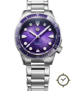 Eine Taucheruhr-Uhr mit einem vielseitigen 39mm Gehäuse, das an fast jedes Handgelenk passt, gefertigt aus Edelstahl mit einem Zifferblatt in lila und einer besonderen "sunburst radial texture"-Oberfläche.