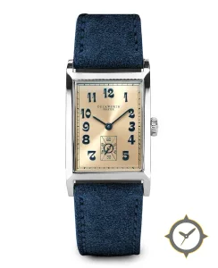 Eine Dress-Uhr mit einem 25mm Gehäuse im Vintage-Stil gefertigt aus Edelstahl mit einem Zifferblatt in gold und einer besonderen "sunburst"-Oberfläche.