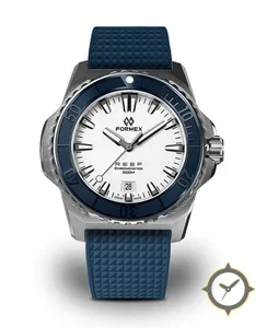 Eine Taucheruhr-Uhr mit einem markanten 47.5mm Auftritt am Handgelenk, gefertigt aus Edelstahl mit einem Zifferblatt in weiß und einer besonderen "matte"-Oberfläche.
