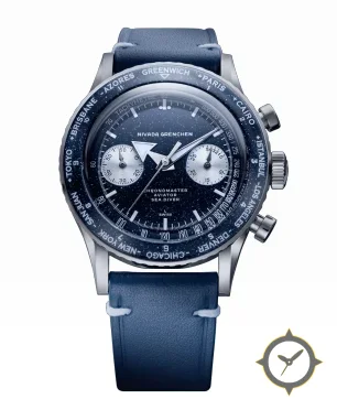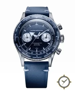 Eine Chronograph-Uhr mit einem markanten 41.5mm Auftritt am Handgelenk, gefertigt aus Edelstahl mit einem Zifferblatt in marineblau und einer besonderen "aventurine / starry (sparkling granular)"-Oberfläche, ideal für Weltenbummler dank der Weltzeit-Funktion.
