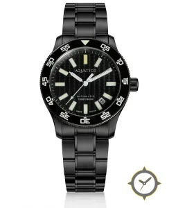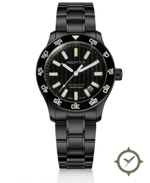 Eine Taucheruhr-Uhr mit einem 31.5mm Gehäuse im Vintage-Stil gefertigt aus Edelstahl mit einem Zifferblatt in schwarz und einer besonderen "carbon-weave"-Oberfläche.