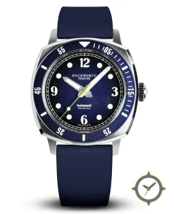 Eine Taucheruhr-Uhr mit einem markanten 46mm Auftritt am Handgelenk, gefertigt aus Edelstahl mit einem Zifferblatt in blau und einer besonderen "wavy/engraved wave texture"-Oberfläche.