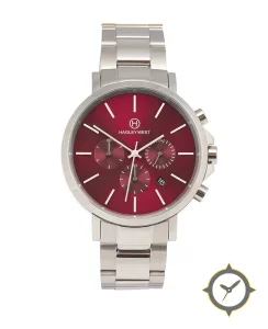 Eine Chronograph-Uhr mit einem vielseitigen 40.5mm Gehäuse, das an fast jedes Handgelenk passt, gefertigt aus Edelstahl mit einem Zifferblatt in rot und einer besonderen "sunburst"-Oberfläche.